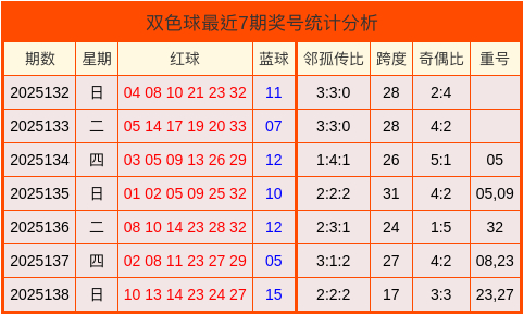 上期开奖数据中得知邻孤传比为2:2:2,奇偶比为3:3,开出2枚重号23,27,跨度数据为17。