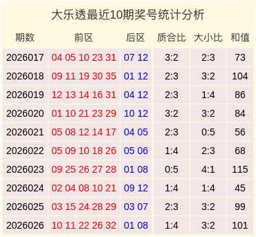 大乐透2026026期开奖,本期奖号:前区10、11、22、26、32,后区01、08。其中前区奖号质合比为1:4,大小比为3:2,和值为101。